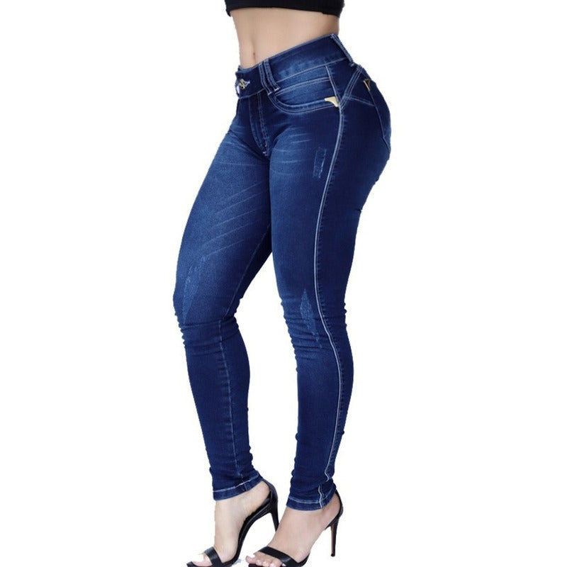 Calça skinny fabricada em tecido macio jeans com lycra, com bojo removível no bumbum.